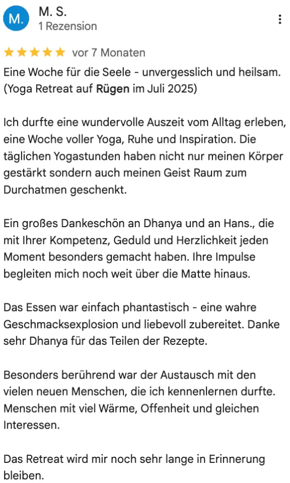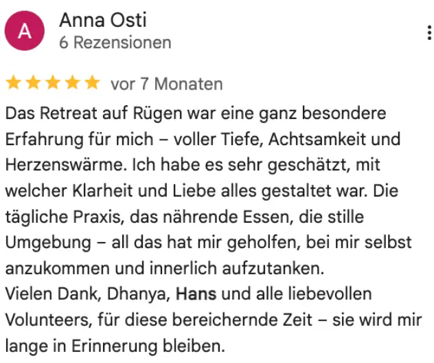 Nach dem Retreat gehst du nicht zurück in „ich sollte wieder mehr üben“. Du gehst in eine klare Struktur – mit Begleitung und einer Gruppe, die dranbleibt. Die Praxis gehört zu deinem Tag wie Zähneputzen – ohne dass du dich jedes Mal neu motivieren musst.